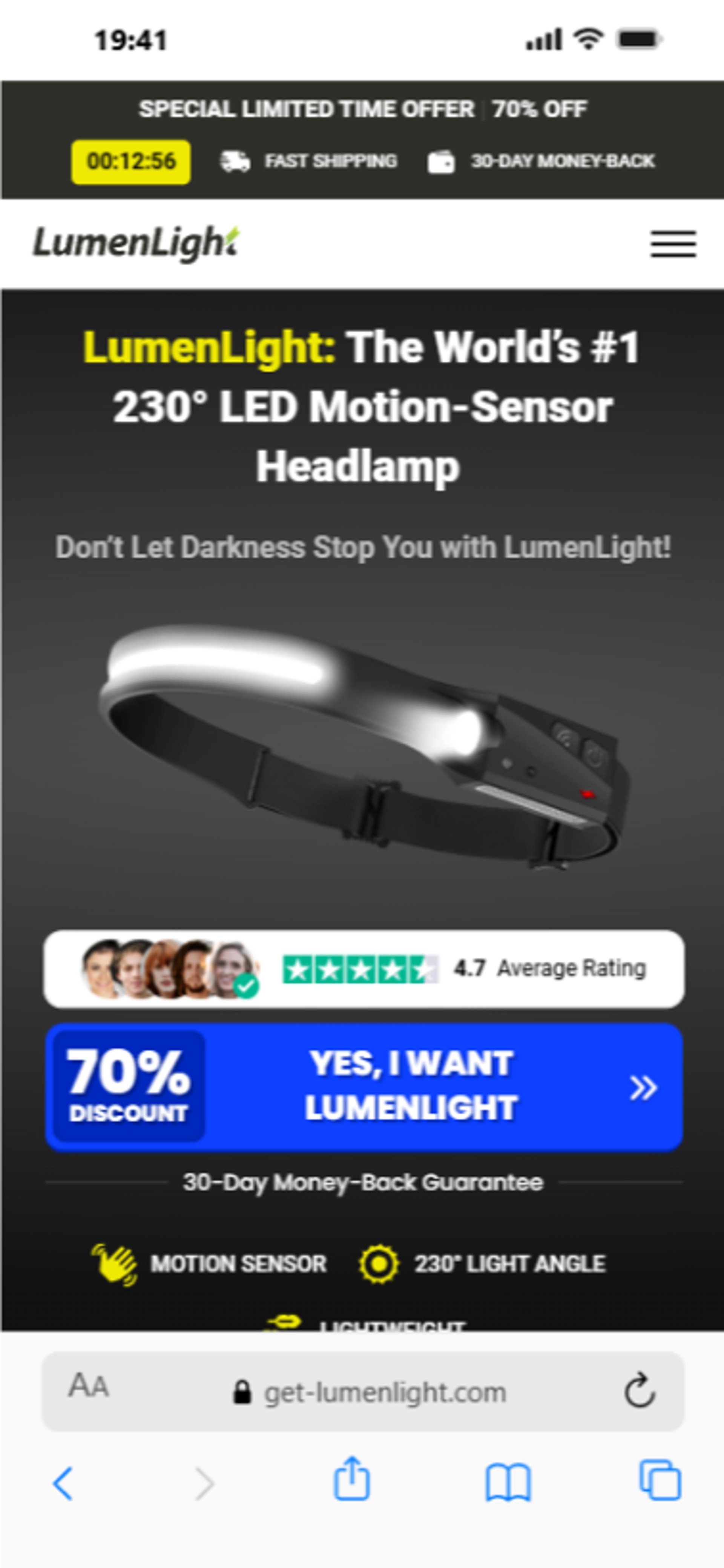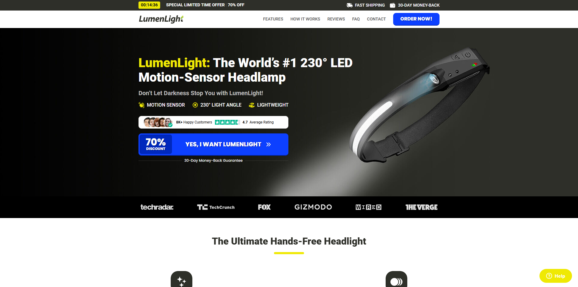 LumenLight is a powerful, ultra-bright LED headlamp designed to transform any dark environment into a safe, well-lit space — whether you’re camping, working at night, hiking, handling home repairs, or facing a power outage. Boasting 1200 lumens of intense brightness and a 230° wide-angle beam, LumenLight delivers complete visibility around you — no more blind spots or struggling to see ahead. With five adjustable light modes and a motion-sensor activation system, you can switch between high-intensity spotlight and ambient glow, or simply wave your hand to turn the light on/off — perfect for when your hands are occupied or dirty. The adjustable headband is comfortable and fits all head sizes (adults, children or even over helmets), while the rechargeable battery provides up to 8 hours of continuous illumination, easily recharged via USB. The build is waterproof and weather-resistant, ideal for outdoor adventures, rainy nights or rugged work environments. For a limited time, you can buy LumenLight at a special 50% discount with free shipping worldwide, making it an excellent value. On top of that, the product comes with a 30-day money-back guarantee, so if you’re not fully satisfied you can return it risk-free. Whether you need hands-free lighting for outdoor trips, home emergencies, or everyday tasks — at a competitive price with discount, free delivery and refund protection — LumenLight offers convenience, safety, and reliability. Don’t compromise: choose LumenLight and enjoy high-performance lighting, comfort, durability and peace of mind, all in one compact, portable package.